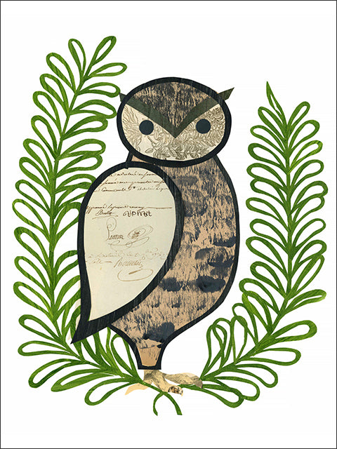 Ephemera Owls are constructed from various papers, antique and handpainted including: